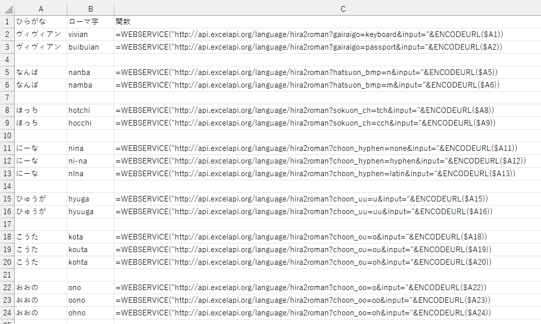 =WEBSERVICE("https://api.excelapi.org/language/hira2roman?input="&ENCODEURL($A2))