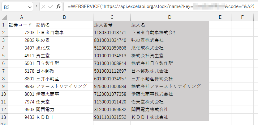=WEBSERVICE("https://api.excelapi.org/stock/name?key=xxxxxxxxx&code="&$A2)